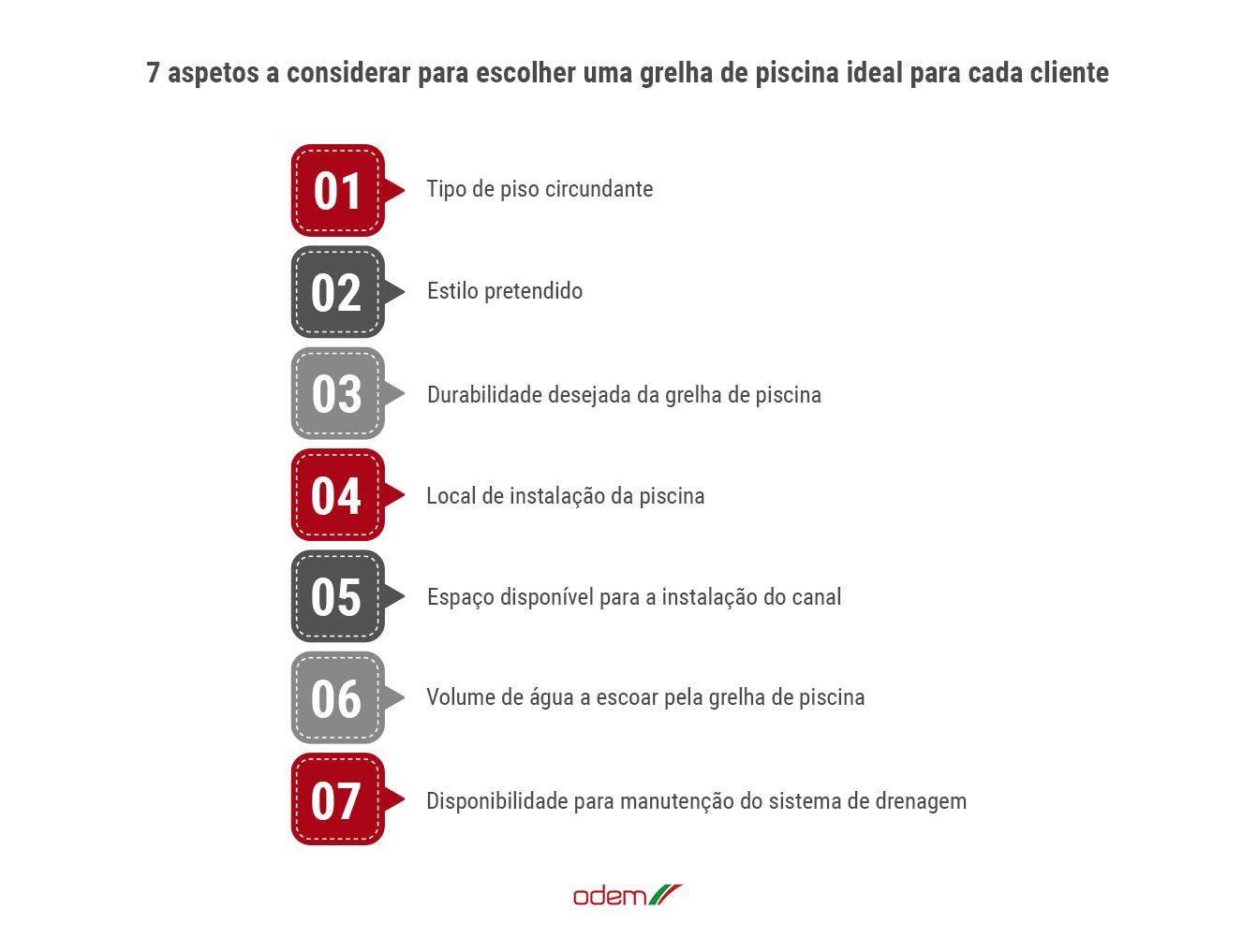 Na ODEM, contamos com uma equipa especializada, com forte conhecimento das soluções de escoamento de água. Deste modo, oferecemos ajuda para escolher a grelha de piscina mais adequada para o seu cliente, com base no que pretende.